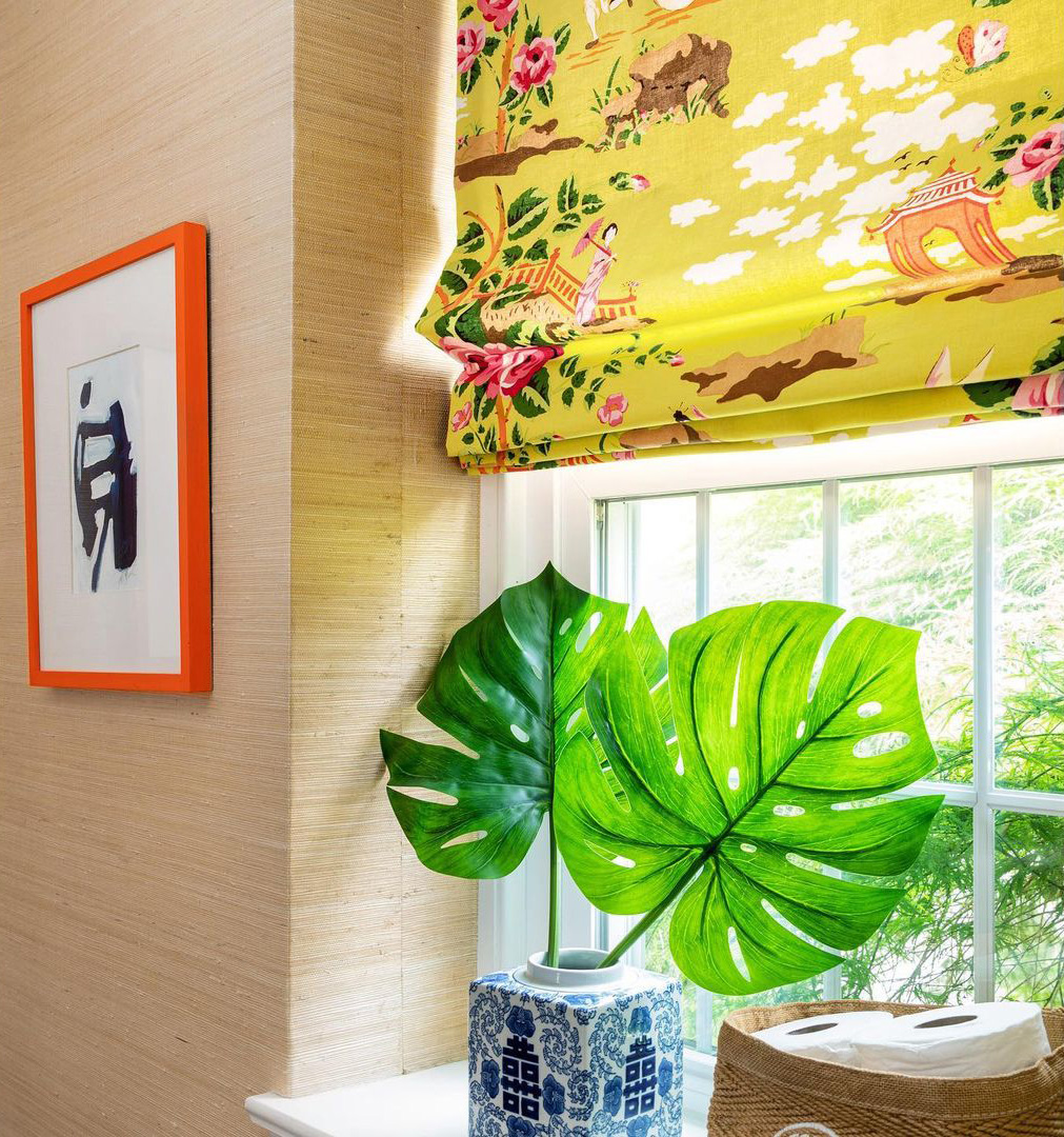 There is something about chinoiserie chic that gets me every time! The Baldwin Bamboo wallpaper mixed with the whimsy of Dragon Dance is so entertaining and makes for such a happy space. The colors of light blue and orange, with some grounding neutrals makes for a fresh spin on the traditional chinoiserie chic.