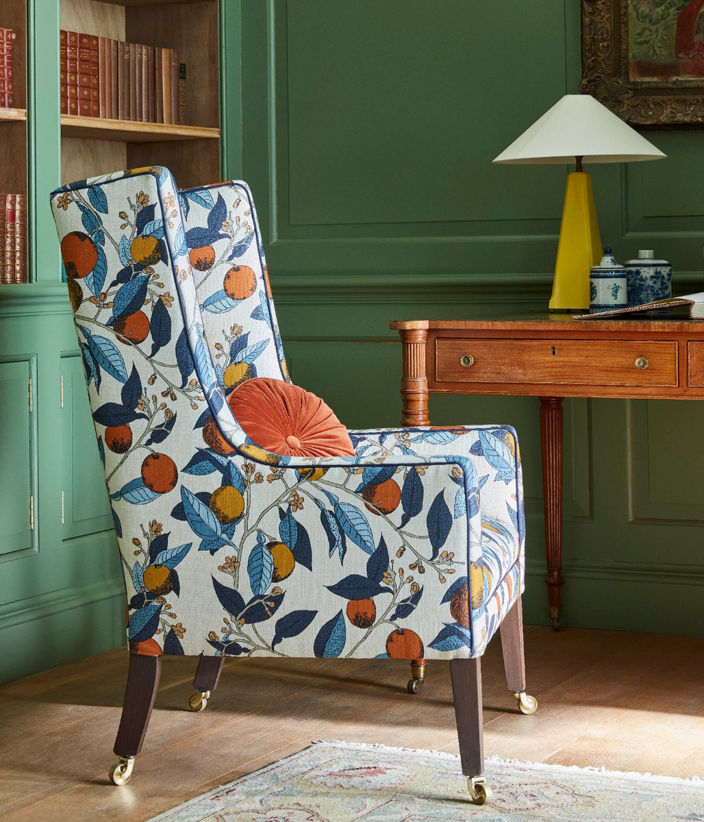 The Orangery fabrics coordinate seamlessly with James Hare’s signature color groups.