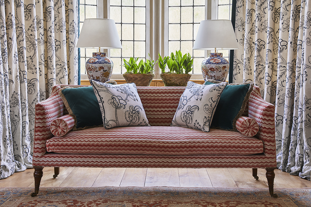 Sofa Upholstery: Espalier Velvet. Drapery: Arboreal. Pillows: Beauchamp Velvet and Arboreal.
