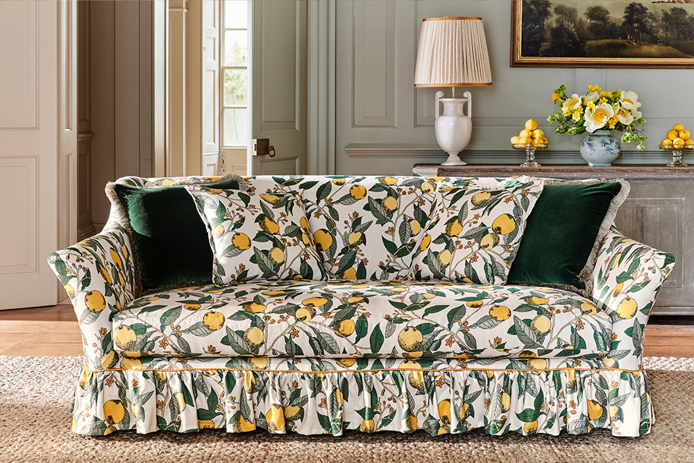 Sofa Slipcover: Orange Grove. Pillows: Beauchamp Velvet & Orange Grove.