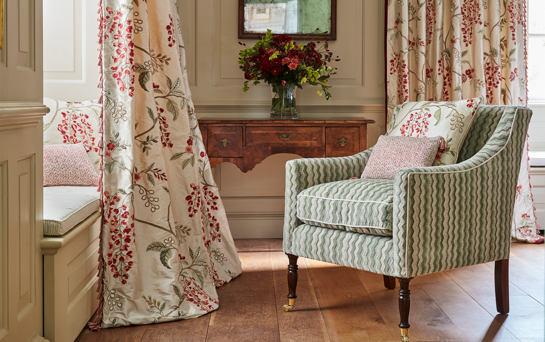 Drapes: Wisteria Vine Silk. Chair Upholstery: Espalier Velvet. Throw Pillows: Wisteria Vine Silk and Flori.