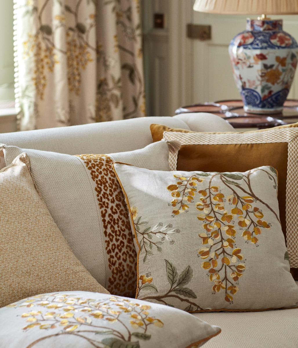 Drapes: Wisteria Vine Linen. Pillows: Wisteria Vine Linen, Flori, Hampton with Panthera Braid and Beauchamp Velvet with Apiary Trim.