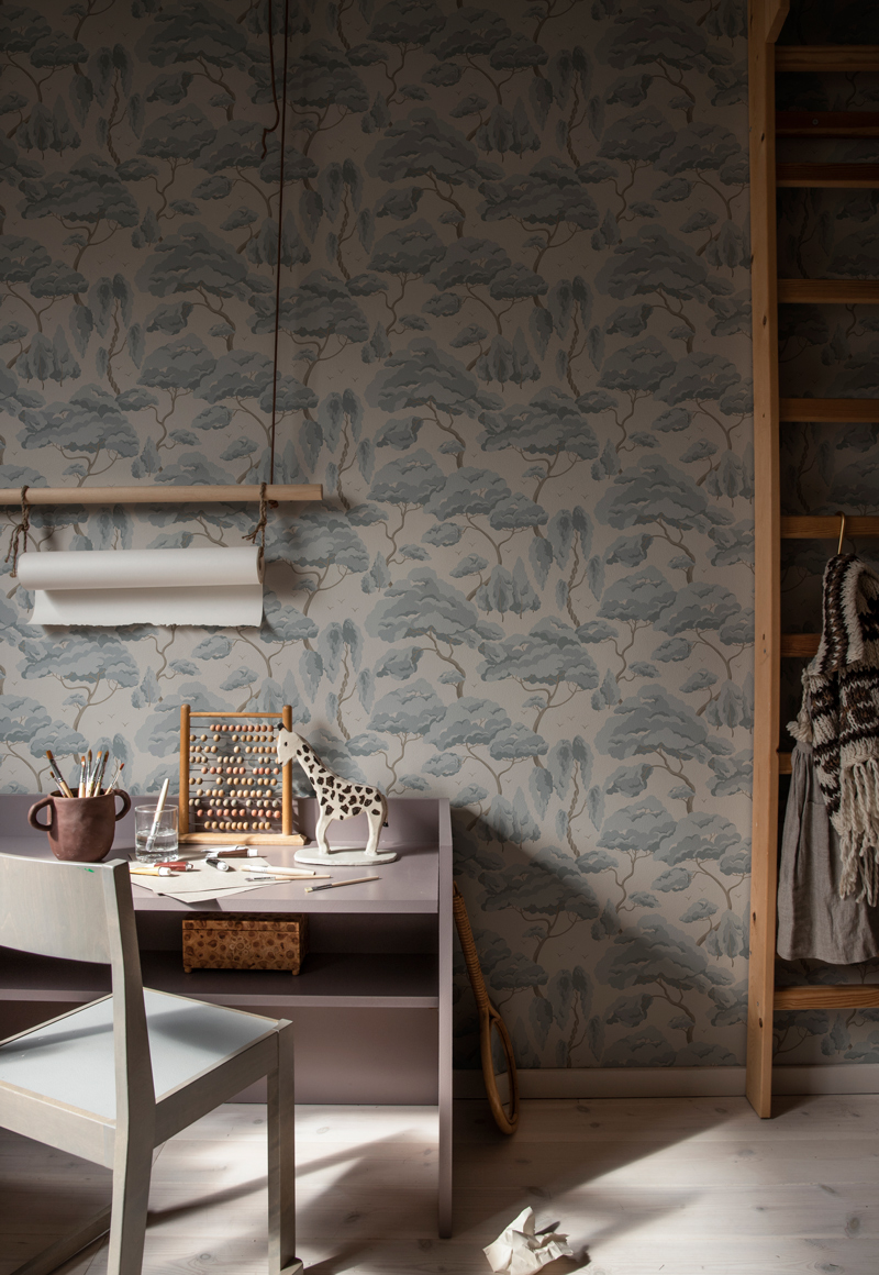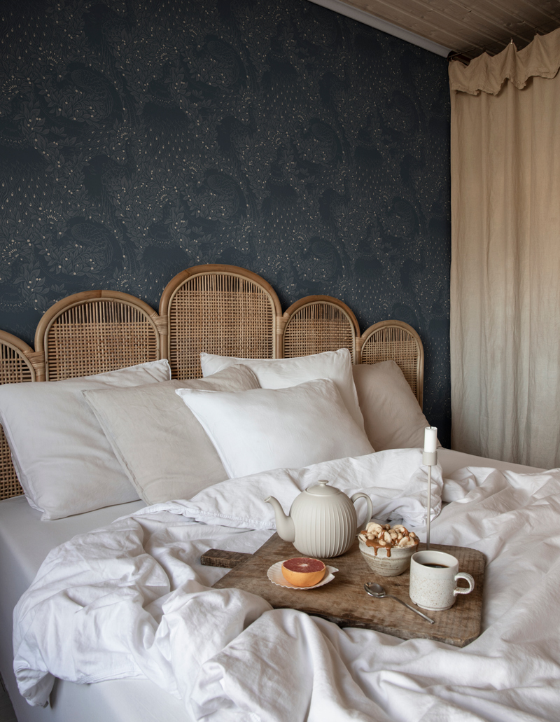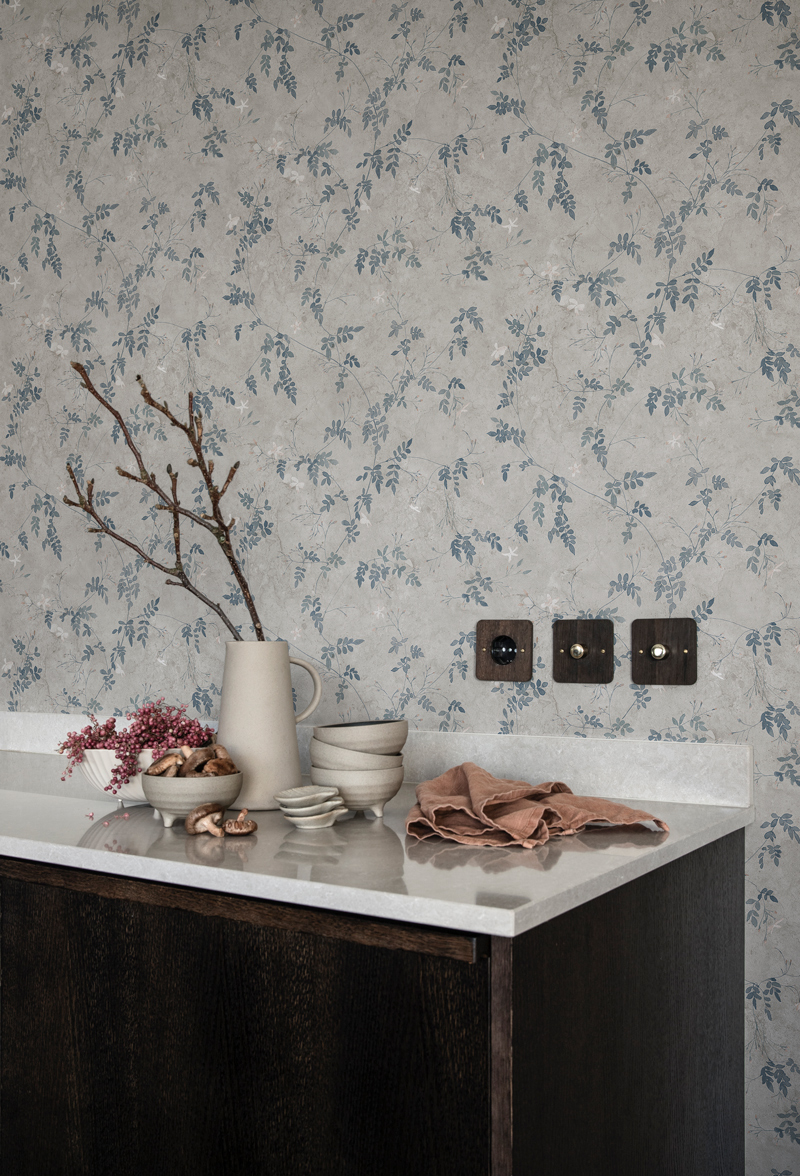 This pattern celebrates exquisite small hand-drawn forget-me-nots among the foliage, creating sweet tranquility.