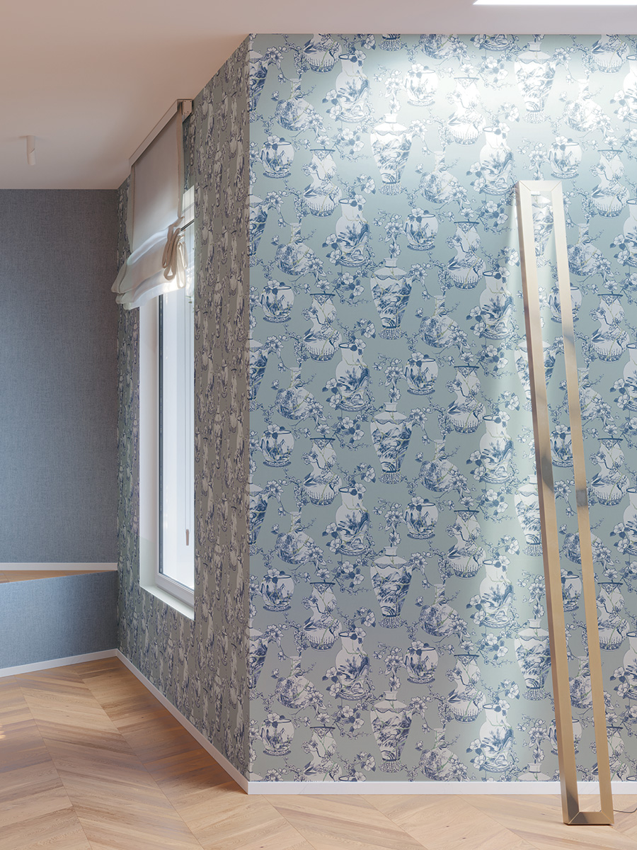 This pattern depicts its namesake technique of repairing broken porcelain using lacquer and gold powder, with large vases joined together among peach blossoms. The pearlescent colorway is a playful twist on traditional Japanese motifs and transforms walls into a work of art. Pairs beautifully with UNITO SELINE - METALLIC.