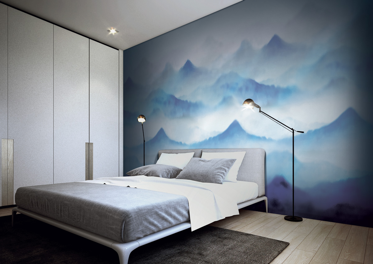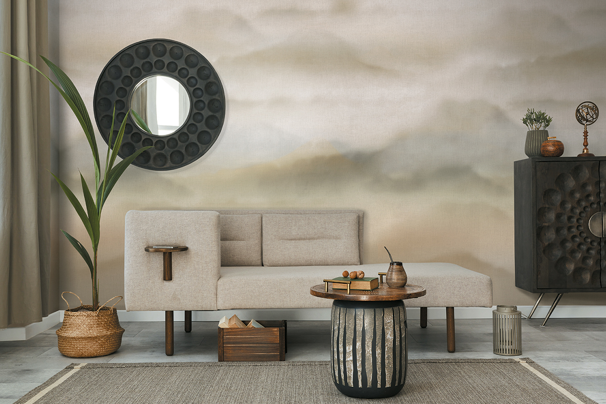 This mountainous landscape motif is drawn through declensions of amber tones on a pearlescent background, dissolved to create the effect of a watercolor painting. Its stylized forms have a misty look that evoke a sense of calm and reverie.