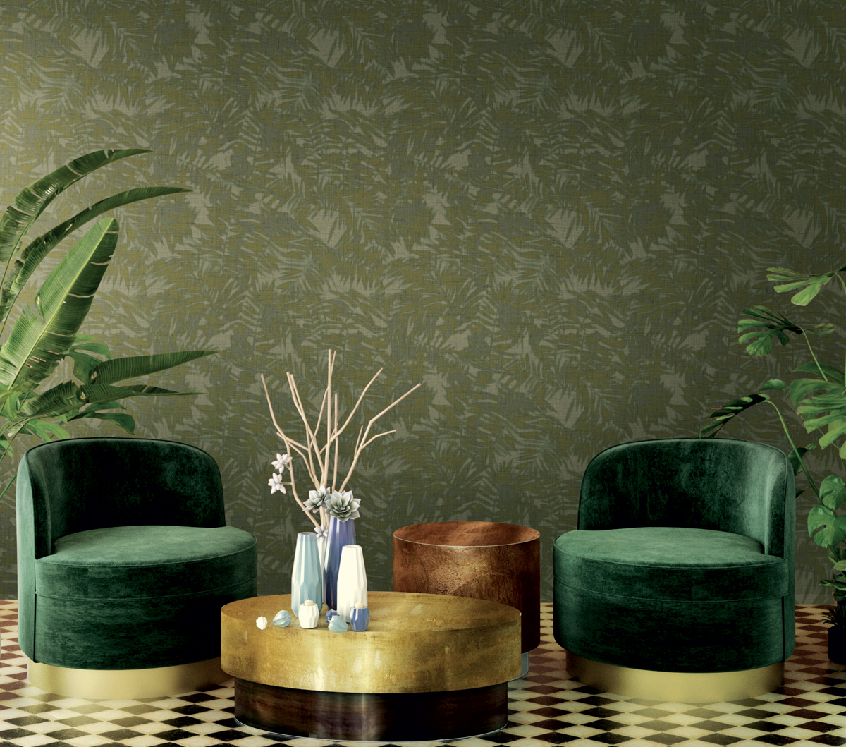 This foliage motif vinyl wallcovering brings the beauty of outdoors inside the home and comes in striking colorways.