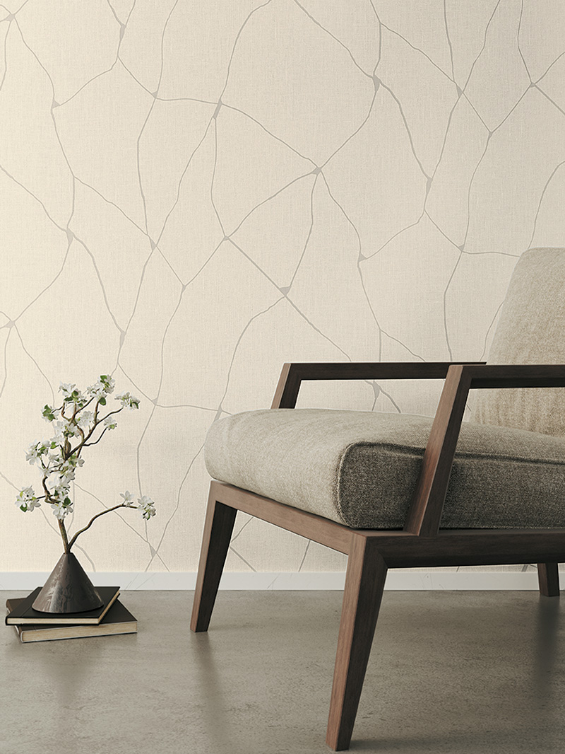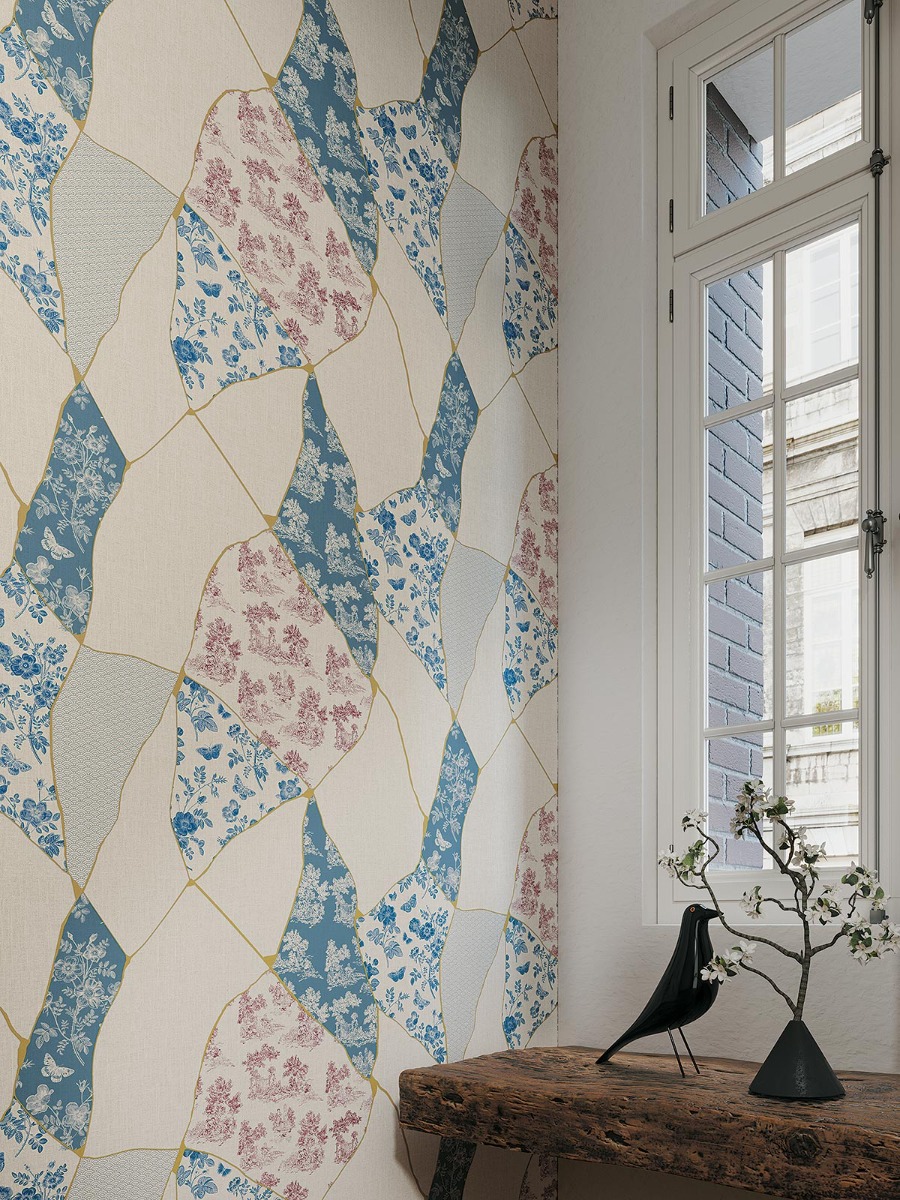 An abstract interpretation of its namesake technique, Kintsugi features a harmonious mix of motifs, fragmented by gilded lines to form an exquisite collage. Available in six complementary color combinations, this patchwork-like wallcovering sets a truly unique atmosphere in the room.