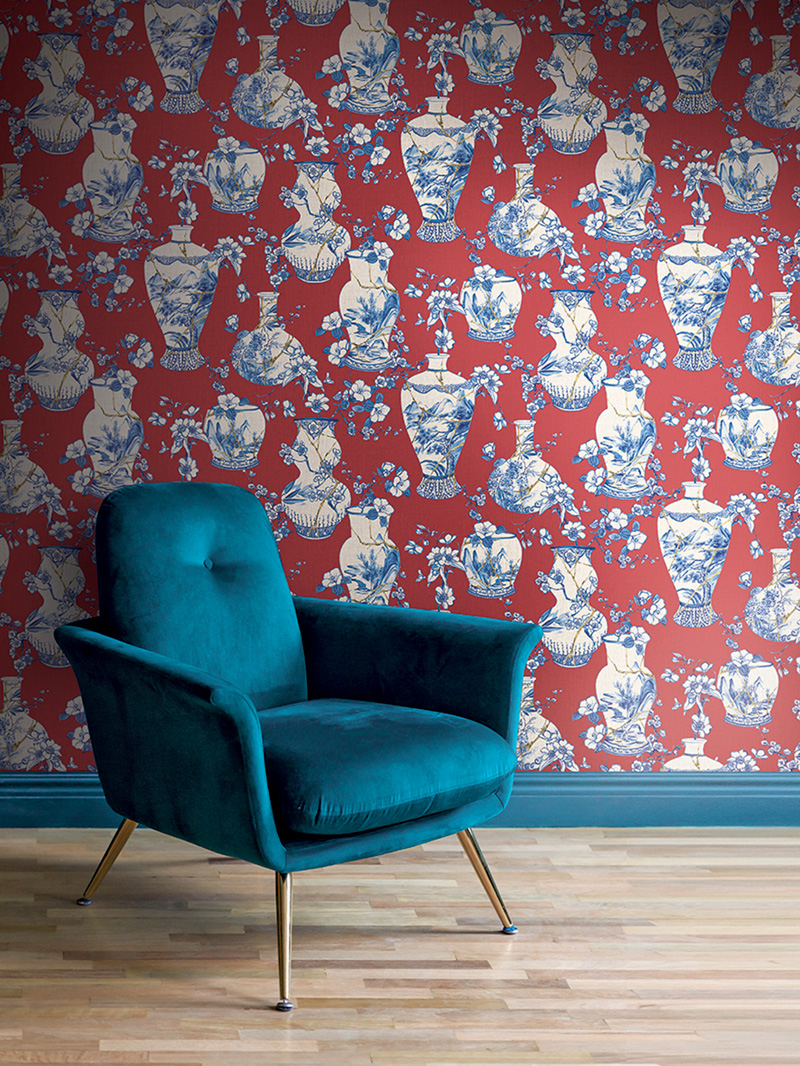 Kintsugi Pot depicts its namesake technique of repairing broken porcelain using lacquer and gold powder, with large vases joined together among peach blossoms. Offered in six show stopping colorways, this playful twist on traditional Japanese motifs transforms walls into a work of art.