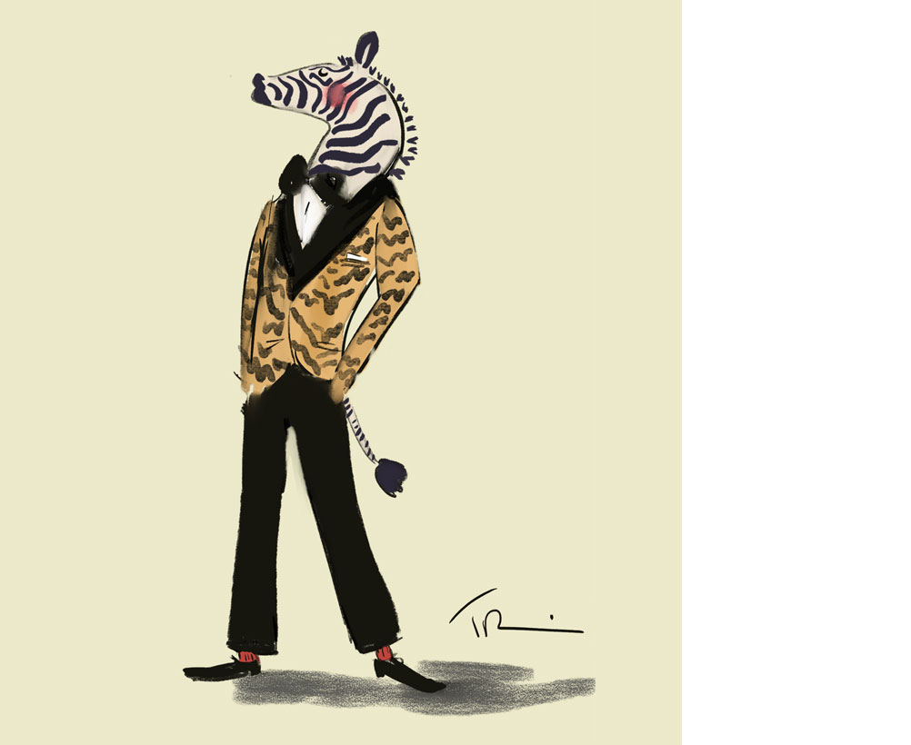 “When I think of iconic design, the Scalamandré zebra immediately comes to mind. Is there a pattern in the world that manages to be so stylish, whimsical, and mysterious all at once? In fact, it’s the mystery in the design that really appeals to me. Who is this zebra and what is he up to when he’s not gracing the walls and furnishings of the chicest rooms? It’s been a great honor and lots of fun imagining the private life of this legendary figure. From my perspective, he’s a fearless dresser, a connoisseur of the finer things in life, and always up for a celebration. I’d love to sit next to him at a dinner party. ” – Tug Rice